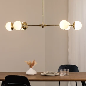 As luminárias suspensas são penduradas de forma a que se possa ver completamente a pessoa à nossa frente e, ao mesmo tempo, não haja o risco de bater com a cabeça quando nos levantamos. Isto significa que deve haver uma distância de 80 a 100 cm entre o bordo inferior do candeeiro suspenso dourado e o tampo da mesa.
