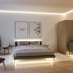 A utilização de perfis de alumínio cria uma linha contínua de luz com um aspeto profissional. Especialmente em combinação com coberturas difusas, a luz parece homogénea e sem reflexos. Ideal para interiores orientados para o design com uma linguagem de design clara. Uma fita LED é também um complemento elegante para áreas de estar em plano aberto ou interiores minimalistas, combinando funcionalidade e estética.
