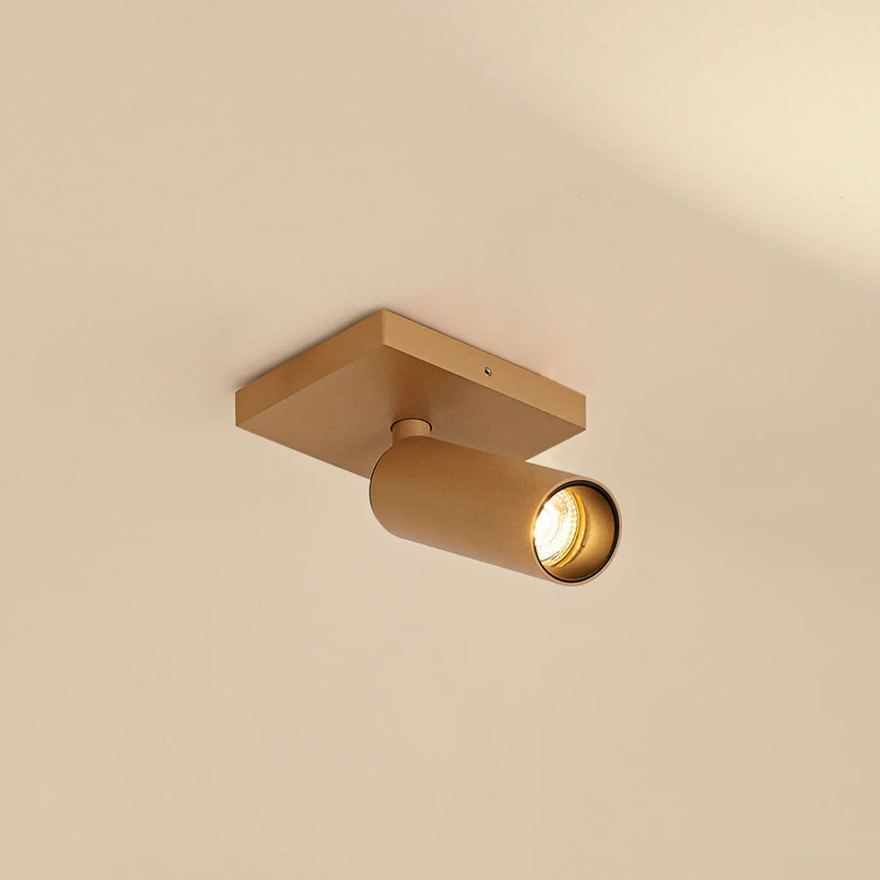 O candeeiro tem uma cabeça cilíndrica em alumínio que pode ser inclinada 90 graus e rodada 250 graus. Assim, é possível iluminar uma determinada parte da divisão, conforme necessário. O suporte angular do projetor passa despercebido graças às suas dimensões estreitas.