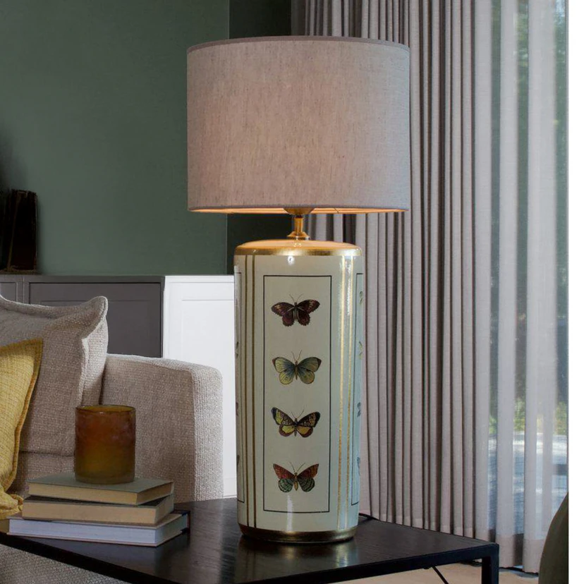 O candeeiro de mesa Lucca combina elegância intemporal com um toque de charme vintage. A combinação de tecido de linho de alta qualidade e cerâmica finamente trabalhada confere ao candeeiro uma estética especial, que realça qualquer divisão. A cor bege do abajur é complementada por motivos de borboletas e padrões dourados na base, criando uma imagem harmoniosa.