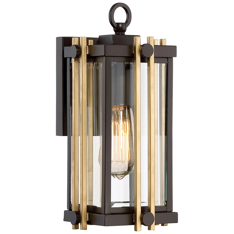 Candeeiro de parede exterior Goldenrod em forma de lanterna com apliques dourados O candeeiro de parede exterior Goldenrod, em forma de lanterna clássica, tem apliques amovíveis nas laterais. As hastes metálicas douradas são fixadas com dois parafusos, que podem ser retirados à mão para remover o aplique. As aplicações também podem ser pintadas numa cor diferente para personalizar o design da lanterna. A estrutura da lanterna é feita de aço com um acabamento em bronze escuro. O casquilho E27 no interior da lanterna ainda não está montado no momento da entrega e pode ser equipado com uma lâmpada de incandescência adequada para otimizar o efeito da luminária.
