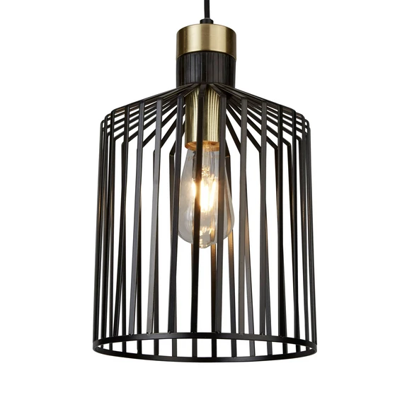 Candeeiro suspenso Bird preto com pormenor em latão O candeeiro suspenso Bird foi fabricado num design moderno de gaiola com um abajur composto por vários suportes metálicos em preto, o que acabou por lhe dar o nome. O pormenor em latão mate na suspensão é decorativo e o suporte da lâmpada no meio do abajur também foi concebido nesta cor contrastante. Para completar o belo aspeto deste candeeiro, deve ser equipado com uma lâmpada de filamento. O candeeiro suspenso Bird pode ser combinado muito bem com outros candeeiros da série. Graças ao abajur aberto em estrutura metálica, emite luz direta em toda a divisão, criando uma iluminação geral com belos efeitos e dando um toque de charme industrial a qualquer divisão.