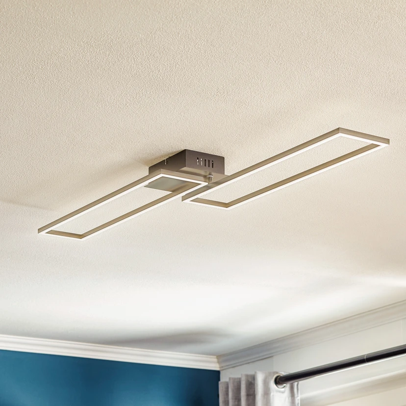 Candeeiro de teto LED de moldura em metal com cor de luz variável e telecomando Duas molduras estreitas e rectangulares em metal preto formam a sombra deste candeeiro de teto LED. Por detrás de coberturas de plástico acetinado, encontram-se os LED, cuja cor da luz pode ser regulada a qualquer momento, desde o branco quente até ao branco universal, através do telecomando fornecido, podendo também ser regulada a luminosidade para adaptar a iluminação às necessidades a qualquer momento. Esta flexibilidade permite uma utilização versátil do candeeiro de teto Mod, quer seja para iluminar a sala de estar, a cozinha ou o escritório em casa. Para além do design de iluminação flexível e ajustável, o candeeiro de teto LED também oferece uma função de luz nocturna e um Tim.
