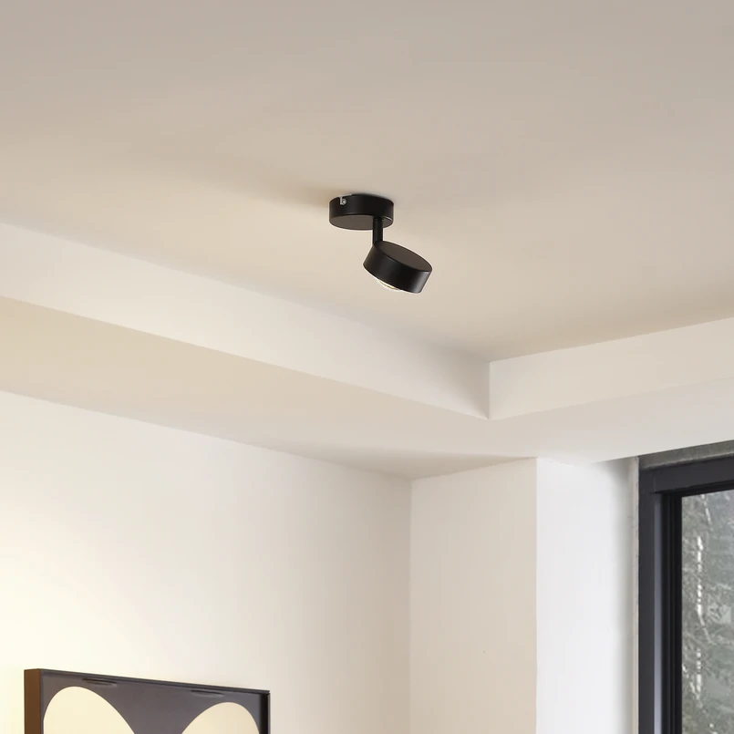 O refletor de teto Jyla com uma única lâmpada é feito de ferro e confere ao ambiente um toque elegante com seu exterior preto. Ao mesmo tempo, seu design discreto permite que ele se integre facilmente em diferentes áreas da casa. Ele é ideal, por exemplo, como fonte de luz para o corredor, a cozinha e a sala de estar ou de jantar. O abajur redondo é ajustável, permitindo um direcionamento individual da luz e uma iluminação ideal da divisão. A lâmpada GX53 necessária, que pode ser adquirida através dos acessórios, tem uma lente abaulada e, por isso, parece uma semiesfera de vidro.
