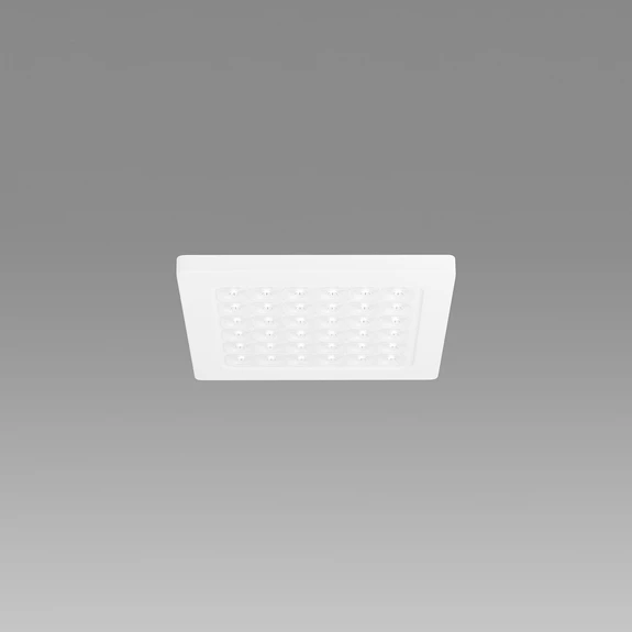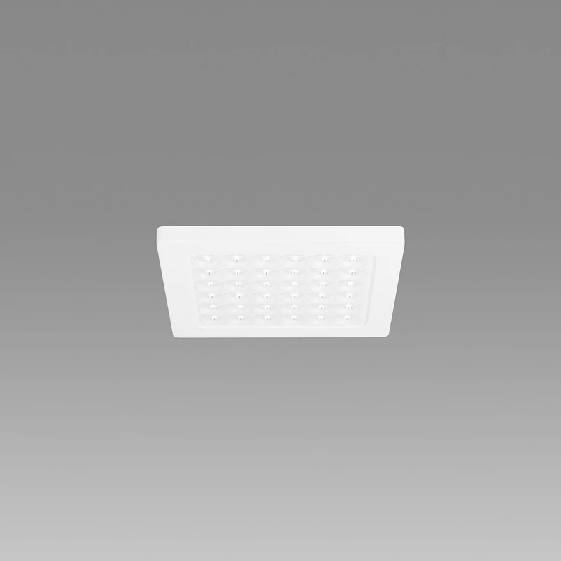 Candeeiro de teto Square LED Dime - luz plana e direcional Graças à ótica especial de colimador "Square Optics" utilizada, o candeeiro LED de superfície Dime Office proporciona uma luz plana e direcional que não cria sombras múltiplas e é Ideal para a iluminação direta de tarefas no escritório. Um módulo MINERGIE® certificado e energeticamente eficiente do fabricante REGENT é instalado no corpo metálico pintado de branco como fonte de luz. Está integrado um dispositivo de controlo Dali - Índice de redução de brilho UGR: < 19 - Resistência ao impacto: IK06 - Luminância: máx. 3000 cd/m²