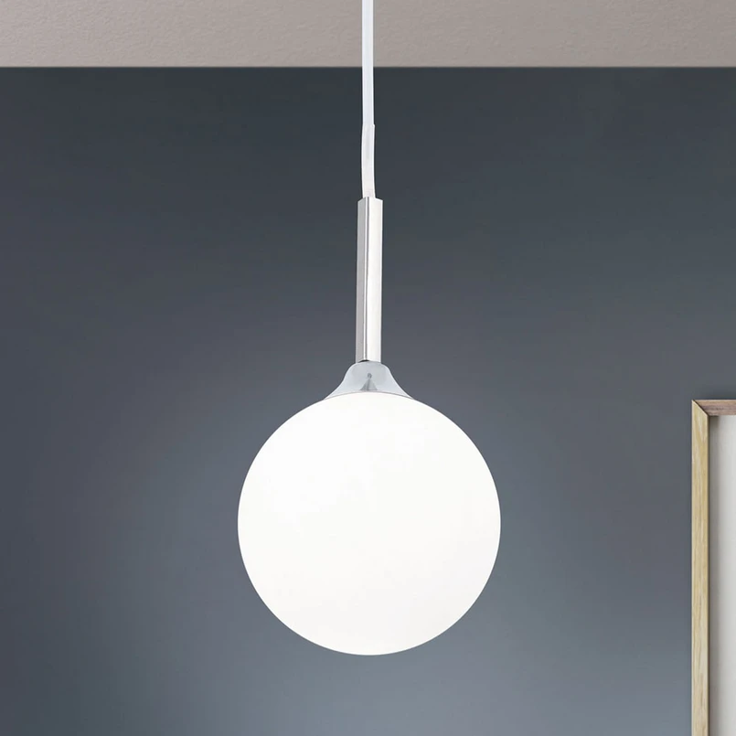 Candeeiro suspenso branco-neve, monoluminoso com globo de vidro