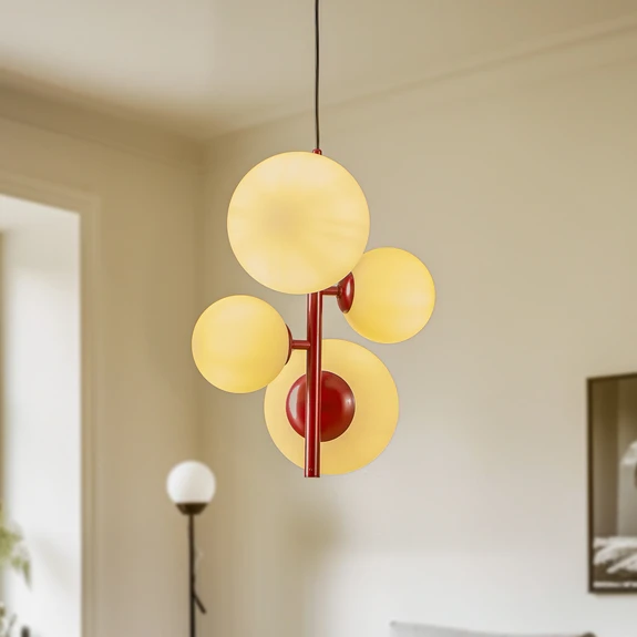O candeeiro suspenso Joel em vermelho vinho e branco fosco combina um design moderno com um acabamento de alta qualidade em metal e vidro. Este candeeiro de quatro luzes é um elemento que chama a atenção em qualquer sala de estar e oferece uma solução de iluminação elegante, funcional e esteticamente apelativa. O candeeiro fabricado na Europa impressiona pelas suas linhas claras e pela combinação harmoniosa de cores, que conferem a qualquer divisão um toque especial.