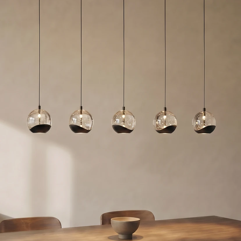 O candeeiro suspenso LED Hayley em preto impressiona pelo seu design moderno e pela combinação de materiais em vidro e metal. A construção alongada com 5 lâmpadas proporciona uma iluminação uniforme e confere um toque elegante às salas de estar e de jantar. Com uma temperatura de cor de branco quente de 3000 K, o candeeiro suspenso cria uma atmosfera acolhedora que convida a relaxar. A fonte de luz LED integrada oferece não só uma longa vida útil, mas também uma iluminação energeticamente eficiente.