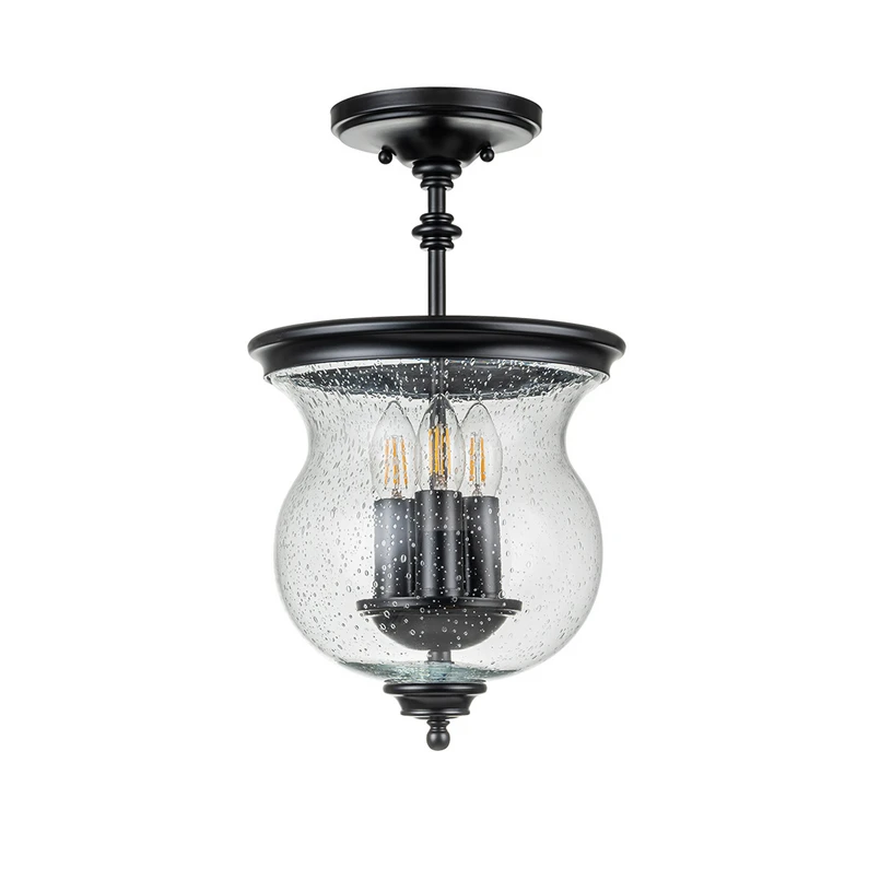 Candeeiro suspenso Pickering Lane com um design especial Pickering Lane é um candeeiro suspenso especial com um design elegante. É constituída por uma estrutura metálica com três casquilhos E14 montados na vertical numa placa. Esta fica no centro de um abajur curvo feito de vidro transparente com finas inclusões de bolhas. A parte superior do abajur é rematada com um anel de metal.