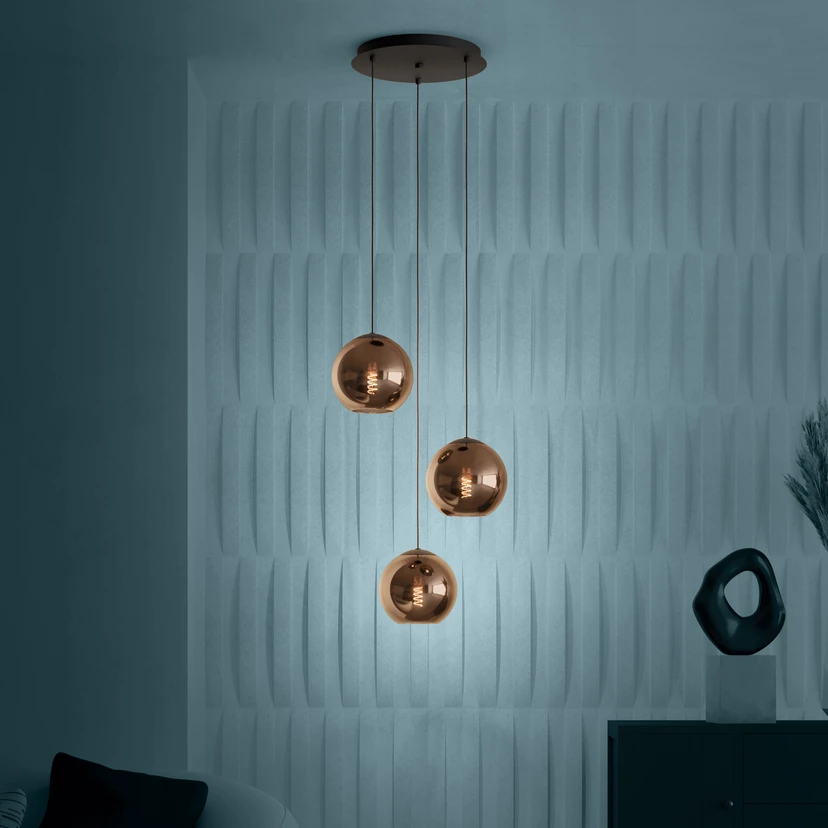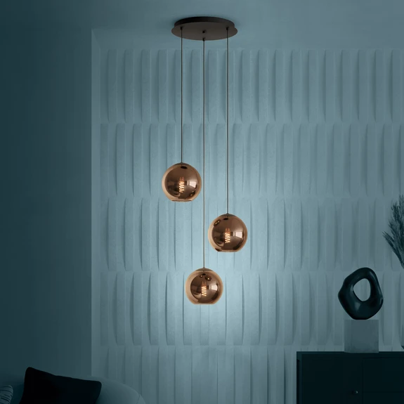 Candeeiro suspenso Cordoba com três abajures esféricos em vidro, vaporizado em cor cobre