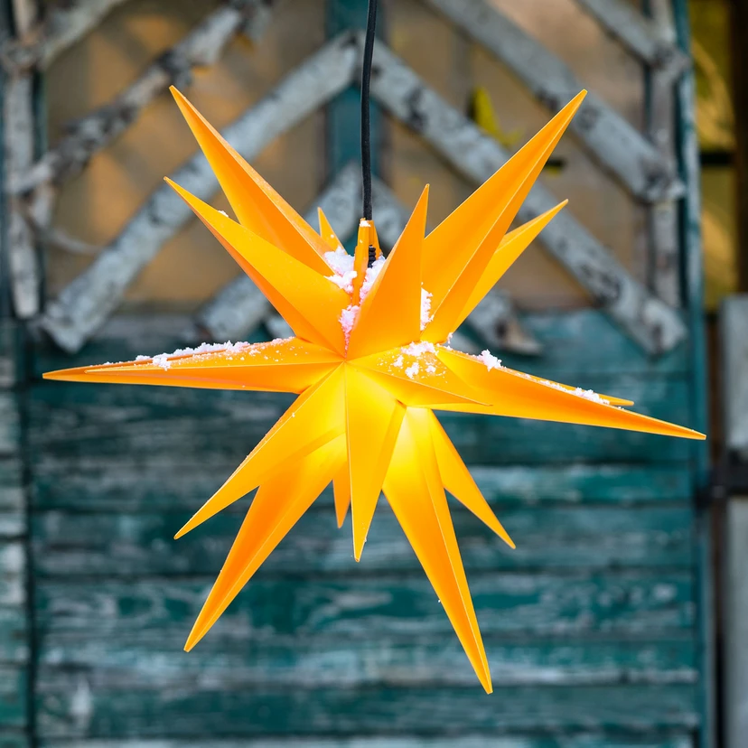 Fantástica decoração de exterior para a época natalícia: estrela de 18 pontas Ganesha Esta estrela de várias pontas é feita de plástico resistente às intempéries e, com a sua classificação de proteção IP44, é também adequada para utilização no exterior, uma vez que nem mesmo as fortes influências atmosféricas, como salpicos de água de todos os lados, podem prejudicar a sua beleza. A estrela cativa as pessoas não só devido ao seu tamanho, com um diâmetro de cerca de 50 centímetros, mas também devido à sua luminosidade. A sua beleza simples espalha uma luz brilhante que pode ser vista de longe na escuridão dos meses de inverno e cria um ambiente auspicioso para a época natalícia.