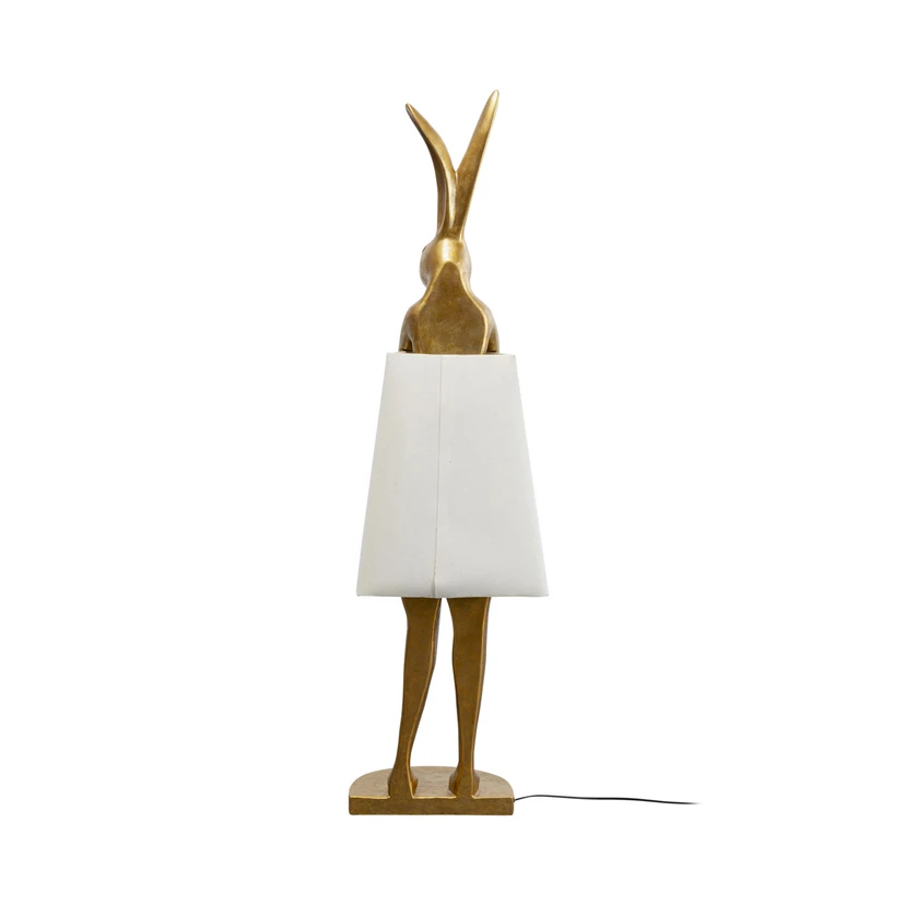 Candeeiro de pé animal casual Animal Rabbit em dourado e branco Como o nome sugere, o corpo do candeeiro de pé Animal Rabbit é constituído por um coelho. Inclina-se casualmente com os braços cruzados sobre a borda do abajur, que o coelho usa como uma saia. A figura do coelho dourado é feita de resina sintética, enquanto o abajur branco é feito de tecido de linho.