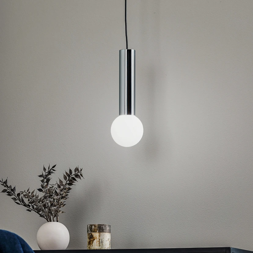 Candeeiro suspenso Mist minimalista para a casa de banho O design do candeeiro suspenso Mist é reduzido ao essencial, o que lhe confere um aspeto particularmente caraterístico. Consiste numa delicada suspensão por cabo com um abajur de vidro redondo e pode ser accionada com uma lâmpada E14. Graças ao seu aspeto minimalista, combina lindamente com casas de banho Mod. O abajur redondo de vidro opalino também garante uma atmosfera de iluminação sem reflexos, tornando-o Ideal para utilização junto a um Spiegel.