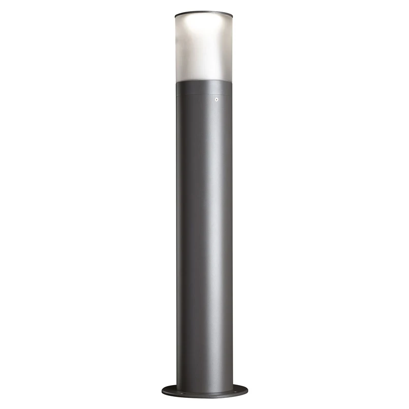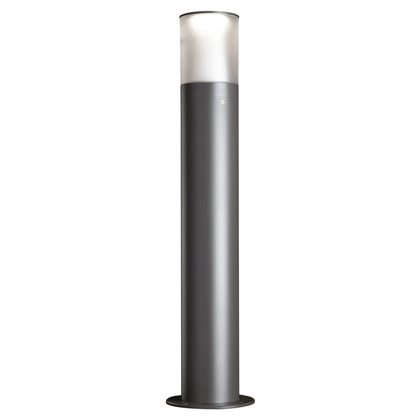 Luminária de caminho redonda LED D-CO - robusta e moderna A luminária de pilarete D-CO é uma fonte de luz visualmente discreta para áreas exteriores que serve como um auxiliar de orientação fiável em parques de estacionamento, entradas de automóveis e caminhos pedonais. A luminária de caminho cilíndrica é constituída por uma estrutura alta em alumínio revestido a pó cinzento e um difusor em policarbonato ligeiramente mate montado no topo. Este último envolve LEDs que emitem luz branca quente horizontalmente a toda a volta. A D-CO resiste facilmente ao vento e às intempéries, bem como a influências mecânicas. Isto é assegurado por uma cobertura com proteção UV, classe de proteção IP65 e resistência máxima ao impacto IK10. É fornecida uma flange para ancoragem - Emissão de luz: inferior 62%, superior 38%; horizontal 360° - Grau de proteção: IP65 - Resistência ao impacto: IK10 - Flange: quatro orifícios, diâmetro do orifício 1,5 cm, distância entre orifícios 14 cm