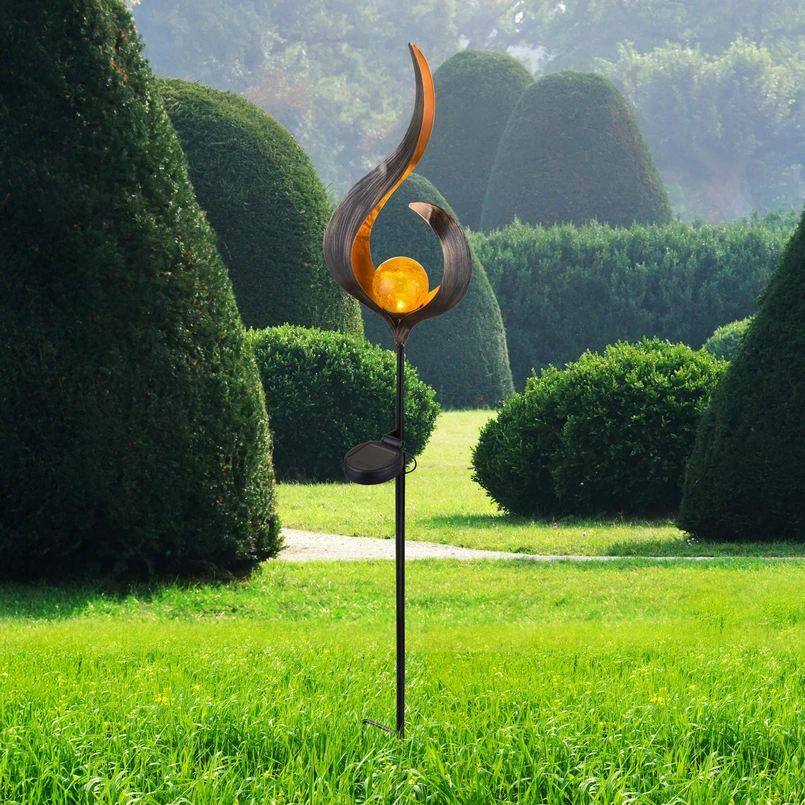 Lâmpada solar LED 33465, cor de bronze Esta lâmpada solar decora canteiros de flores, bordaduras ou até mesmo banheiras com a sua escultura metálica curva com um acabamento cor de bronze no exterior e dourado no interior. Uma pequena esfera de vidro crepitante encontra-se no interior, iluminando a estrutura com o LED branco quente integrado.