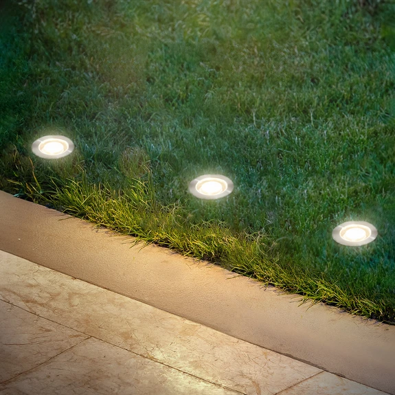 Kit inicial para iluminação exterior de 12 V - três spots LED redondos embutidos Ø 3 cm em aço inoxidável com fonte de alimentação com ficha